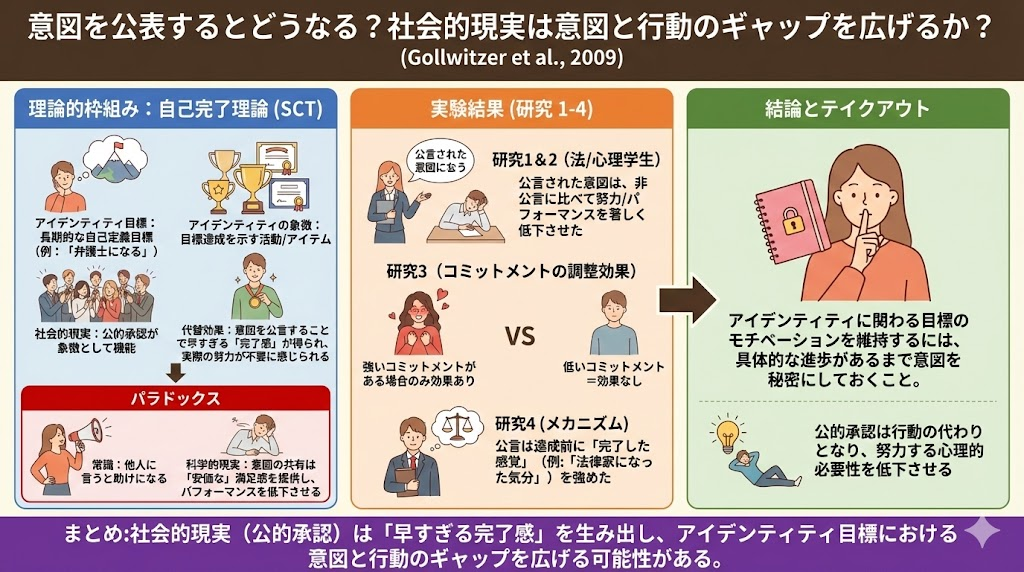 この現象の説明は直感的で、目標=行動意図を他者に公言するとそれだけで他者から認められ、早すぎる充足感が得られるために目標達成のための行動が逆に起きづらくなってしまうというものだ。