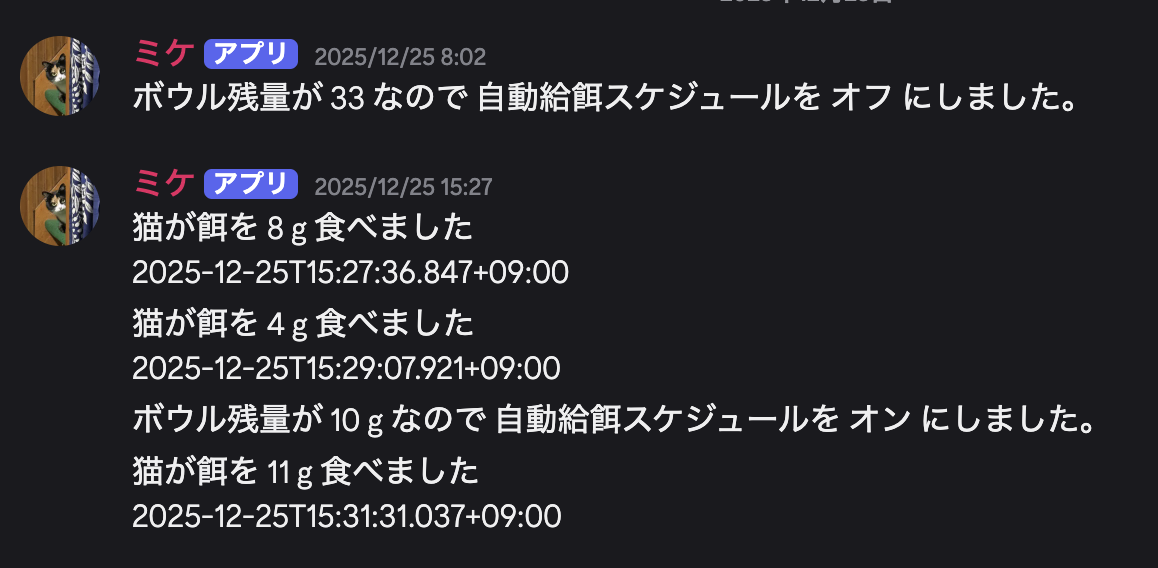 給餌機本体からのトリガーがないのでセルフホストn8nから定期的にポーリングして猫が餌を食べた記録をDiscordに送信したり、ボウルの餌の量に応じて自動給餌スケジュールをon/offするようにした。