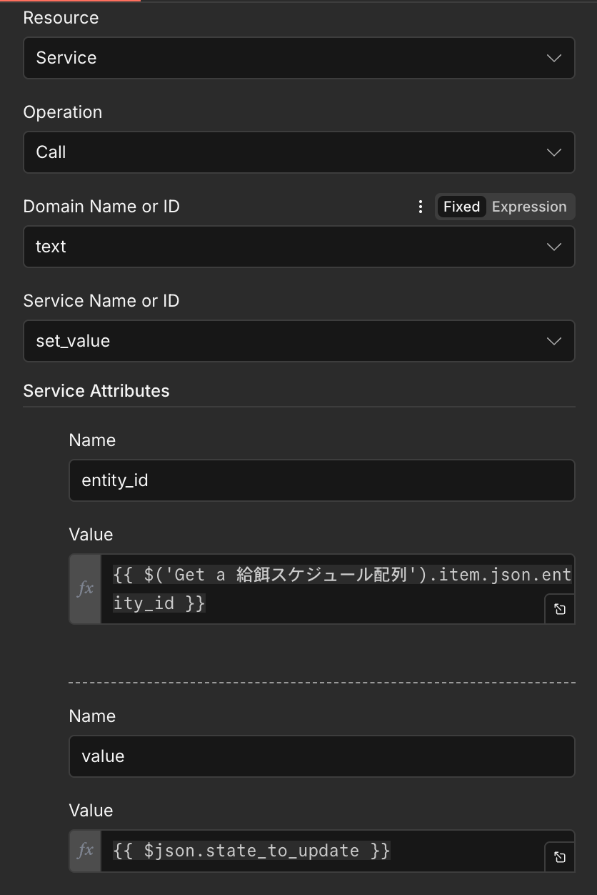 給餌スケジュールの更新はこの給餌プログラム更新というのを何とかするのだろうとずっと試行錯誤していたが、最終的にはDeep Wikiを使ってtext.set_valueサービスを使用してtextエンティティを更新する方法を見つけてなんとか打開した。